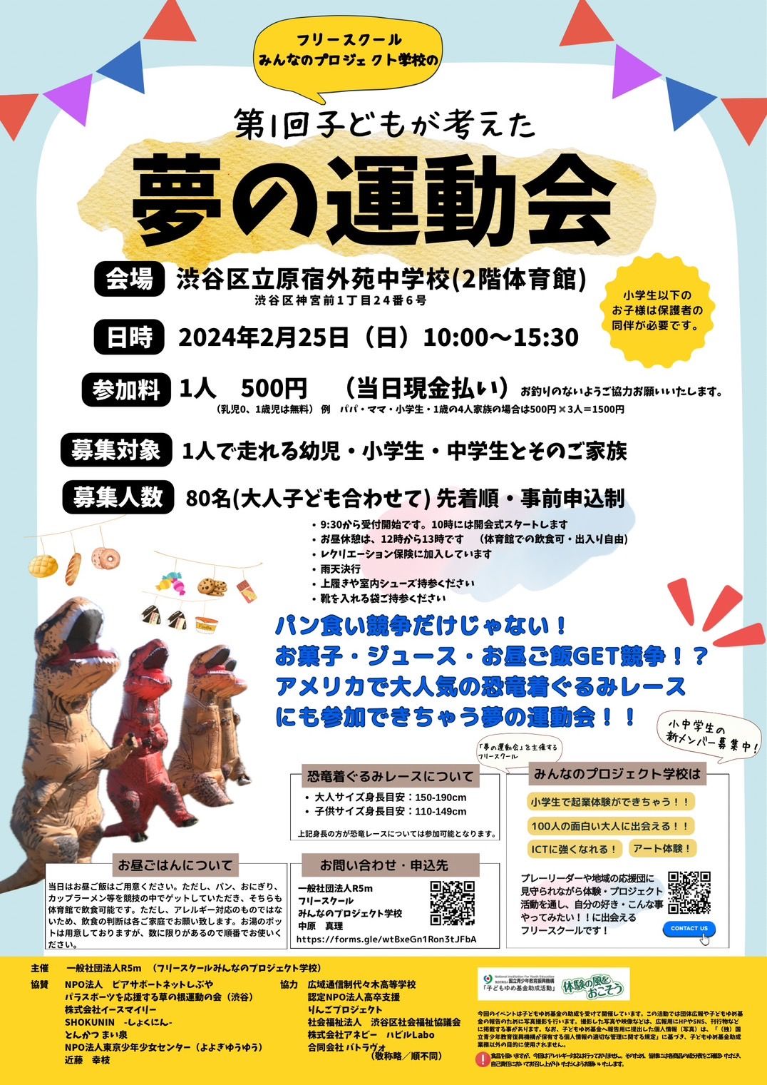 لقد مر عام الآن منذ إنشاء المدرسة، وفي 25 فبراير/شباط، أقامت المجموعة يومًا رياضيًا في صالة للألعاب الرياضية في مدرسة ثانوية عامة في شيبويا للاحتفال بهذه المناسبة. وجاءت الفكرة من الأطفال الذين أرادوا قضاء يوم ممتع. وقد اختاروا الفعاليات التي تضمنت مسابقة لأكل الخبز وسباق الديناصور تي ريكس، حيث تسابق المتنافسون الذين كانوا يرتدون أزياء الديناصورات في جو من الكوميديا. وقد تم تجنيد المساعدة من خلال وسائل التواصل الاجتماعي والمحادثات الشفهية، وجذب 20 من طلاب المدارس الثانوية ومعلمي المدارس. وبفضل منحة من حكومة مدينة طوكيو، تم فتح باب المشاركة في الفعالية لجميع الأطفال، حيث تم توفير ما يصل إلى 80 مكانًا متاحًا.