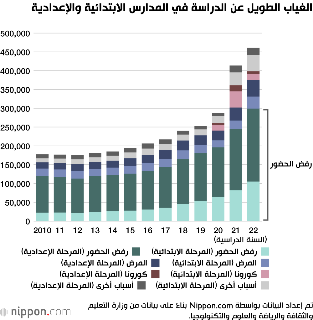 في دراسة استقصائية حول السلوك الإشكالي والغياب عن المدرسة بين الطلاب في التعليم الإلزامي (المرحلة الابتدائية والإعدادية) كشفت عنها وزارة التعليم والثقافة والرياضة والعلوم والتكنولوجيا في السنة المالية 2022، من بين حوالي 300 ألف طفل لا يحضرون المدرسة في المدارس، ما يقرب من 40٪، أو 110 ألف، لم يتلقوا الدعم من مركز دعم التعليم أو منظمة متخصصة أخرى.