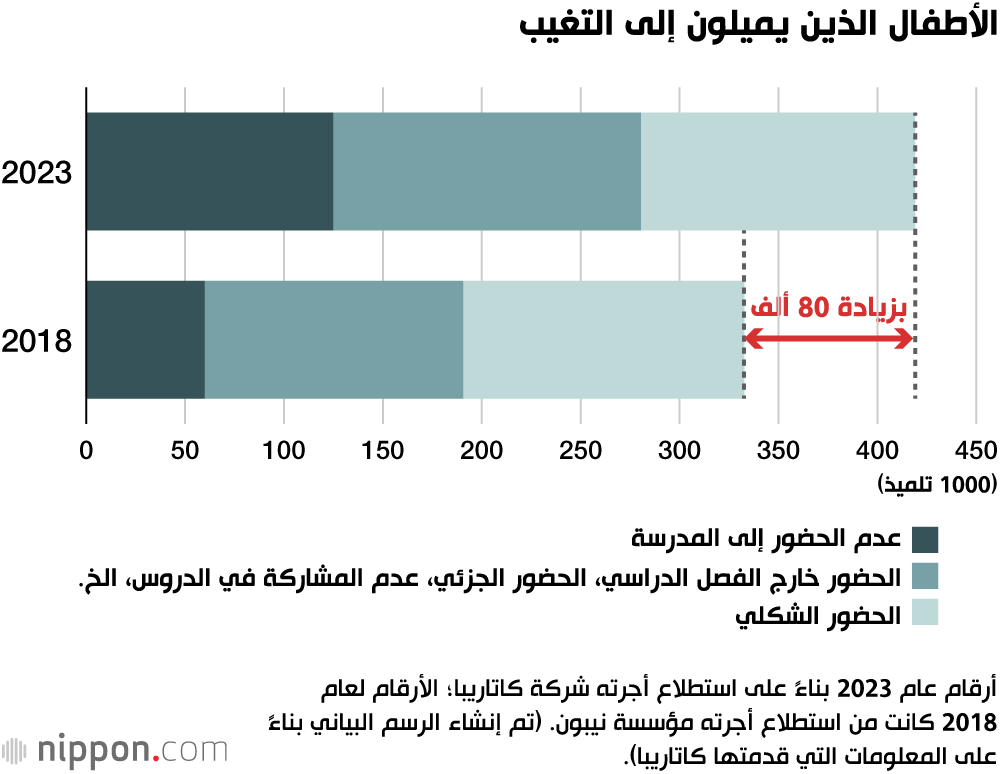 وقد وجد مسح مماثل أجرته منظمة كاتاريبا غير الربحية الداعمة للتعليم في أكتوبر/تشرين الأول ونوفمبر/تشرين الثاني 2023 أن ما يقدر بنحو 410 ألف طفل يميلون إلى التغيب عن المدرسة. وشمل هذا الرقم الأطفال الذين كانوا حاضرين جسديًا في الفصول الدراسية ويتصرفون مثل أقرانهم، إلا أنهم كانوا ”حاضرين بحكم الواقع“ فقط، أي أنهم في أعماقهم لا يحبون المدرسة ومن المحتمل أنهم كانوا يتمنون عدم الحضور. في هذا الاستطلاع، كانت نسبة عدم الحضور إلى المدرسة أعلى بنسبة 26% مقارنةً باستطلاع أجرته مؤسسة نيبون قبل 5 سنوات.